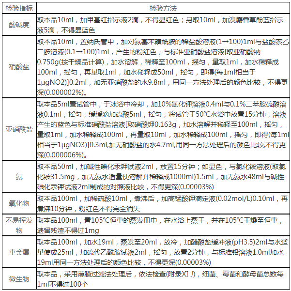 1)總體性狀要求:本品為飲用水經(jīng)餾法、離子交換法、反滲透法或其他適宜的方法制得的無色、無臭,無味的澄清液體,不含任何添加劑。